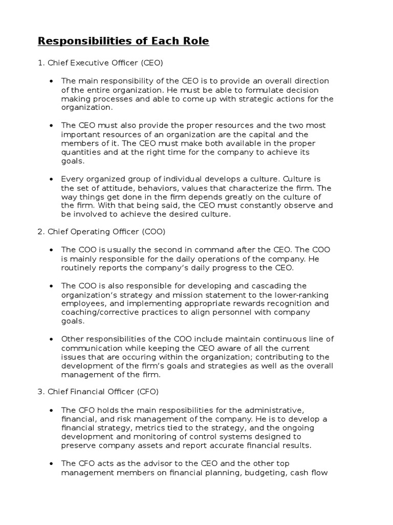 Their main duties and responsibilities include: Provides strategic direction of all financial functions including accounting, budget, credit, insurance, tax, and treasury. Top duties and qualifications a cfo, or chief financial officer, is responsible for overseeing the financial operations of a company and making decisions based on the company's financial stability. They possess strong accounting and analytical skills. In business, management & organization the primary role of a cfo is to handle the financial responsibilities of an organization. They also help set and track financial goals, objectives, and budgets. The primary job responsibility of the chief financial officer (cfo) is to optimize the financial performance of a company, including its reporting, liquidity, and return on investment. Wa shing ton stem 201 8 1. Hospital chief executive officer (ceo) healthtech management services is seeking an experienced hospital chief financial officer (cfo) in a rural, 25 bed critical access hospital in carlinville, il. As a key member of the executive management team, the chief financial officer will report to the president and assume a strategic role in the overall management of the company. Planning, risk management, analysis, and financial reporting. This chief financial officer or cfo job description template is optimized for posting on online job boards or careers pages and easy to customize for your company. The responsibilities and duties section is the most important part of the job description.